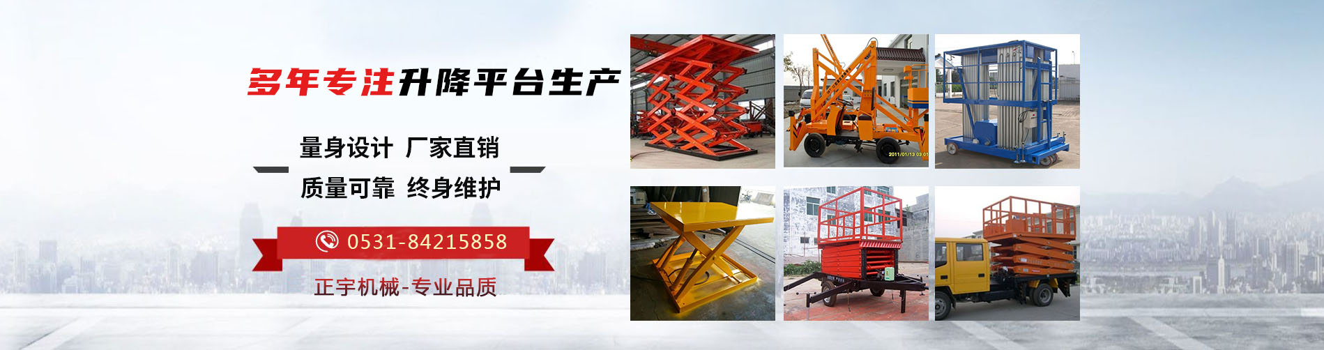 濟南正宇升降機械有限公司是一家集設計、研發、生產和銷售于一體的制造型企業,生產液壓升降機械和高空作業平臺,公司處于素有泉城美稱的山東省濟南市,坐落于濟北開發區。優越的地理位置和便利的交通給公司的發展帶來了充分的條件。正宇液壓技術力量厚,工藝流程先進合理,檢測手段齊全。目前主要產品有:高空作業平臺、登車橋、固定升降機、移動升降機以及鋁合金升降機等等。公司產品具有設計新穎、結構合理、升降平穩、載重安全、操作簡單、維護方便等優點。產品廣泛應用于各個行業,如工礦企業、生產流水線、鐵路、機場、車站碼頭、貨物裝卸升舉、廠房工地、倉儲物流、高空設備安裝等場合。公司以誠信、創新、穩健為宗旨,以品質、完善服務的理念,迎接市場的挑戰。期待您的咨詢!
